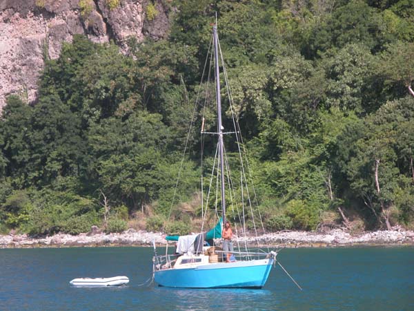 In Deshaies harbor, Guadeloupe - Edward on Scarf shows up!! We haven't heard from him since last year when we met in Guadeloupe. He's been sailing solo around the Caribbean in a 27 foot wooden boat without an engine, and spent much of the winter in Venezuela.