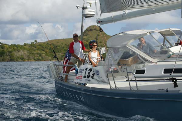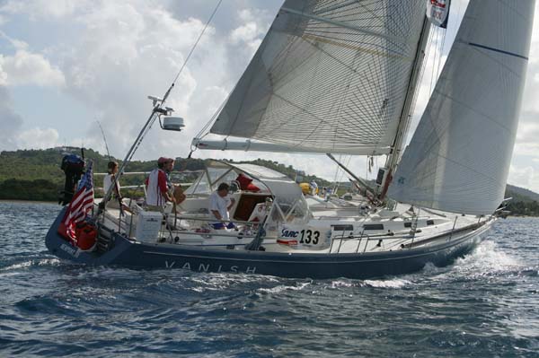 Vanish approaching the finish line of the ARC at Rodney Bay, St. Lucia. Looks like we made it!