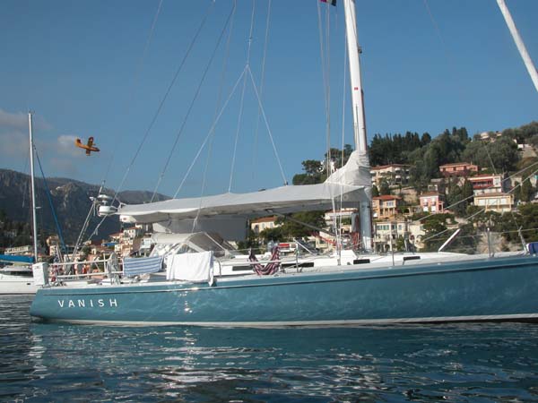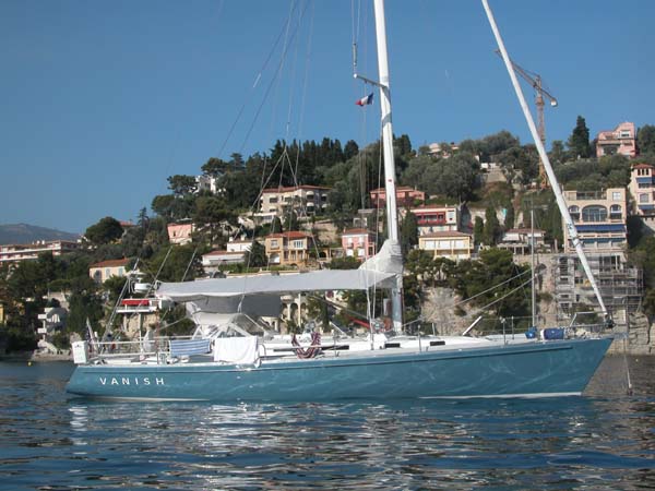 Vanish looking good at Rade de Villefranche. Bill enlisted Brian to help him put the awning up.