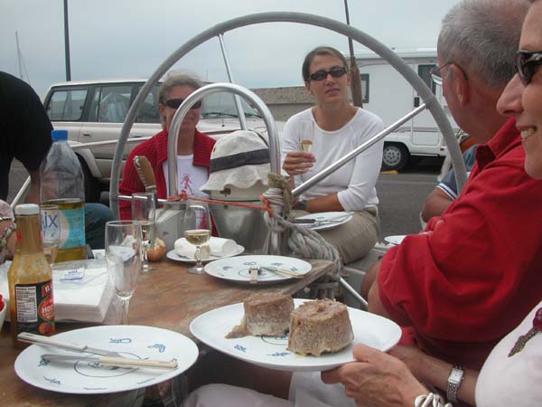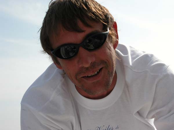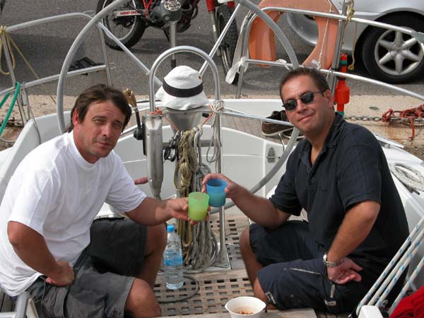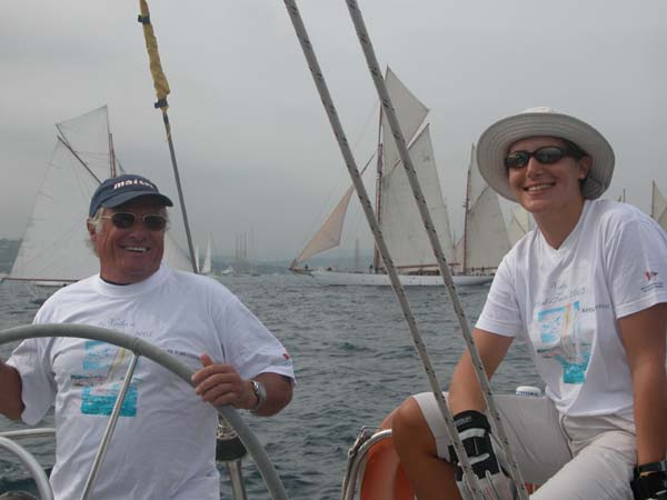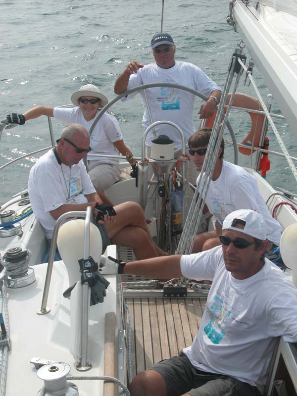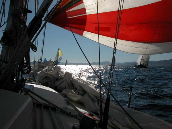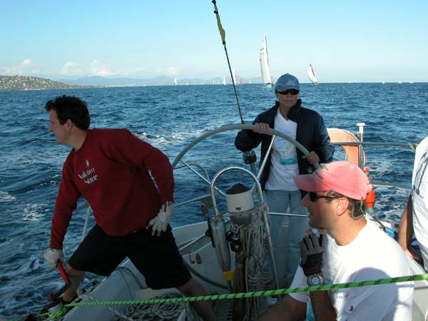Annette at the helm, and Christof grinding the spinnaker as we cruise